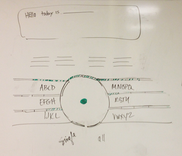 After some mental jogging and dialogue between engineers and designers (see first picture below), it occurred to me that from a user's perspective, the original keyboard would be awkward to use because it would require diagonal and full radial head movement to access the alphabet. Diagonal and full-circle precise movements are more tiring and less natural than simple left to right movement, so I sketched out my idea for a friendlier left to right radial interface (the second picture below). The first image is the result of sketching with a group as part of a problem-solving discussion.